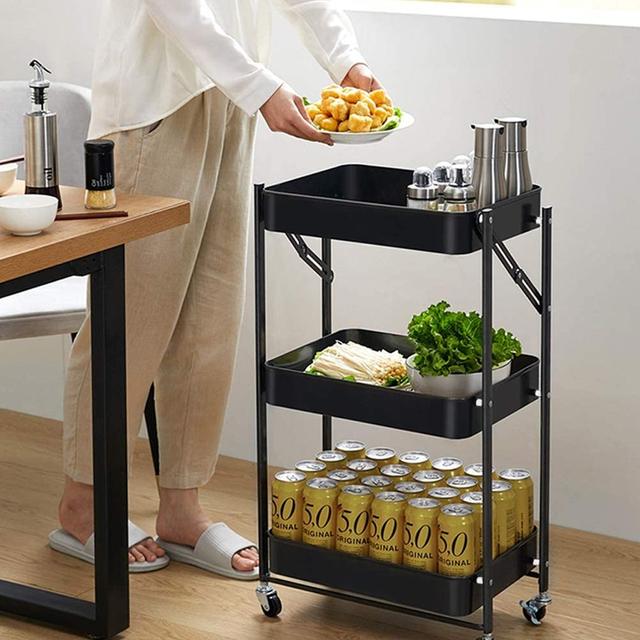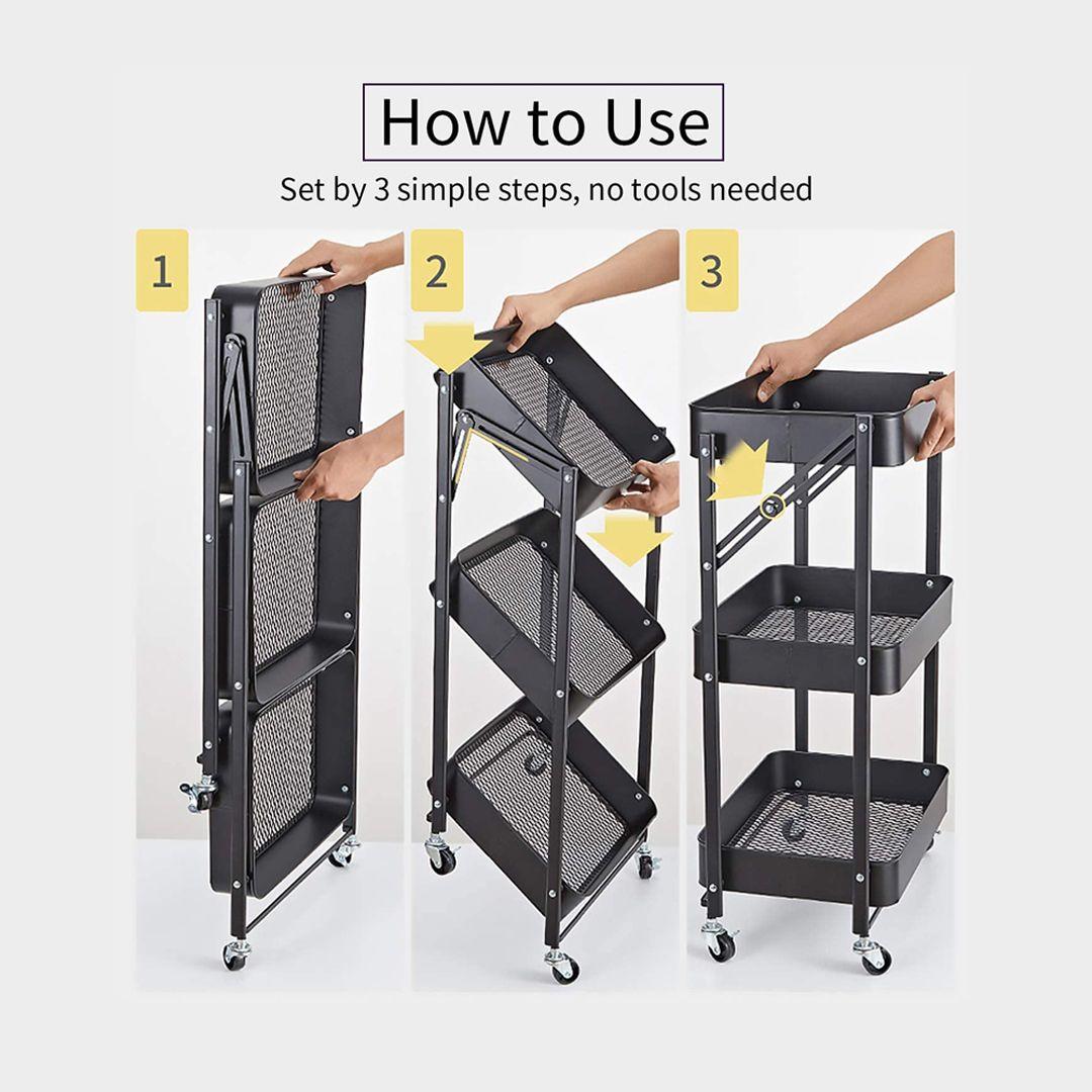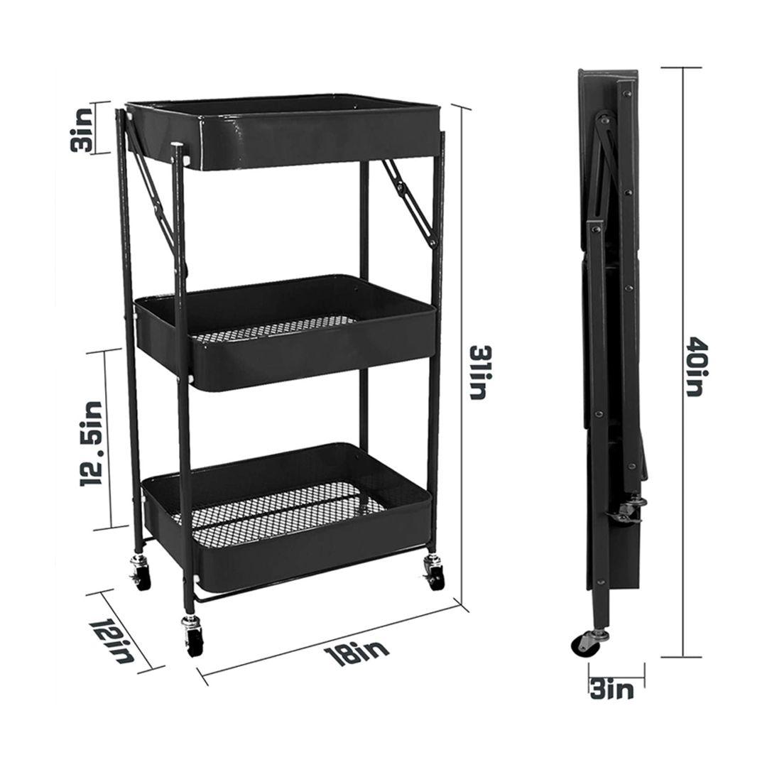 Foldable 3-Tier Metal Utility Rolling Cart Heavy Duty Metal Storage Organizer Mobile Rolling Cart with Caster Wheels Trolley with Shelving Rack