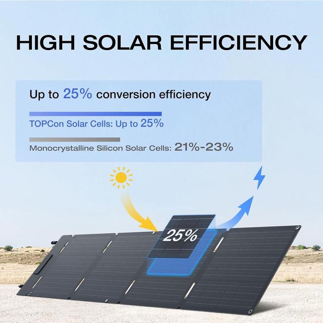 First in the portable solar panel industry to use N-TYPE technology, boosting conversion efficiency to 25%. This means faster charging in a more compact panel, perfect for limited spaces.