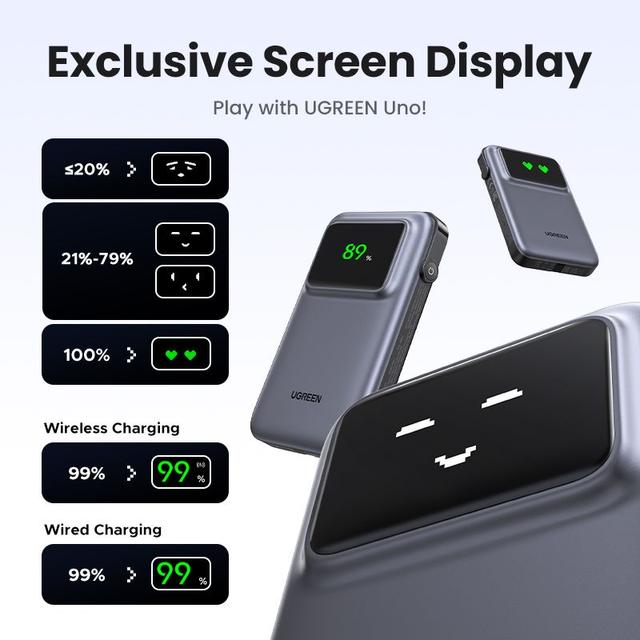 Emoji Display: This fast charging portable charger is also equipped with a TFT display, through vivid and interesting expressions, you can clearly know the remaining battery power, so you don't have to guess when to charge.
