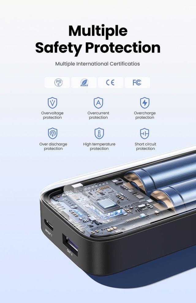 Built-in protection against overcharging, overheating, and short circuits to ensure device safety.