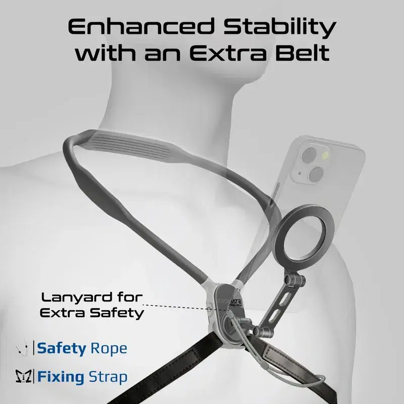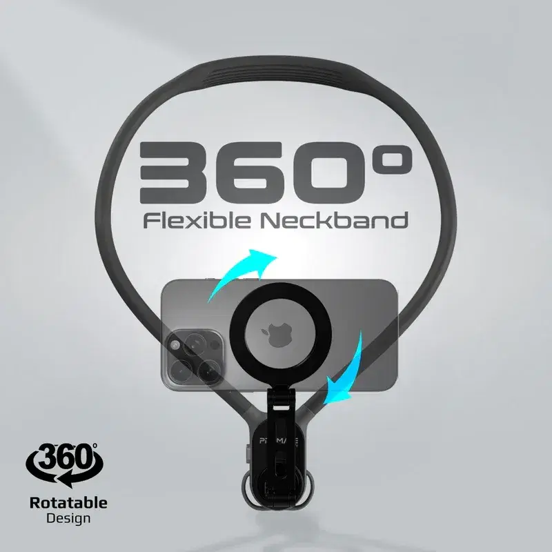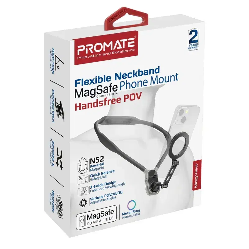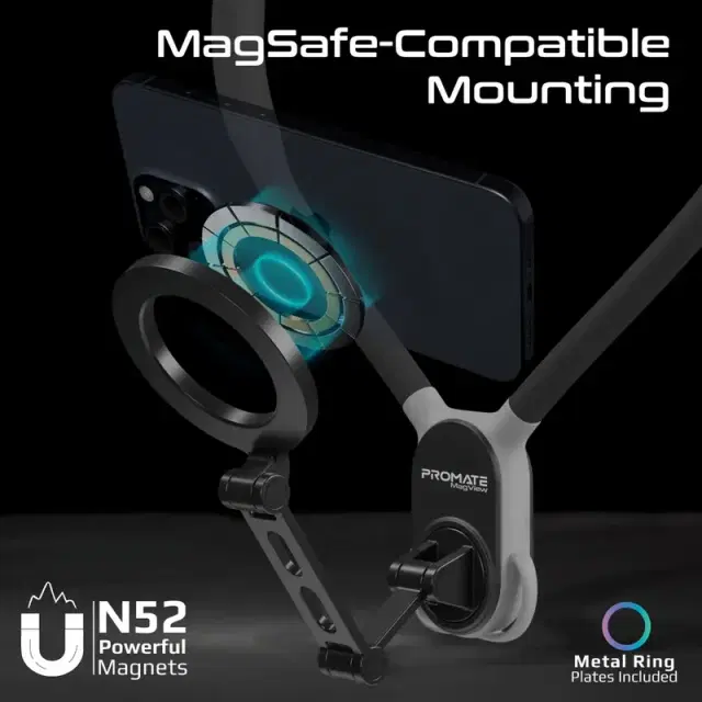 Effortlessly blend comfort and functionality with Promate's MagView, a 360° flexible neckband phone mount designed for the ultimate hands-free POV vlogging experience. Its MagSafe-compatible mounting system ensures seamless alignment, powered by ultra-strong N52 rare earth magnets for a secure hold of your phone during any activity. Built with durable Silicone and premium Aluminium alloy, MagView delivers both reliability and a sleek aesthetic. The ergonomic design ensures all-day comfort, making it perfect for video calls, content creation, or following your favourite navigation apps. Elevate your hands-free perspective with a mount that adapts to your every need, keeping your phone securely in view wherever life takes you.