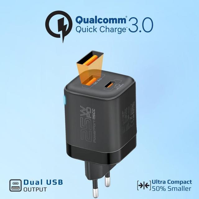 Supports up to ≈ 25W output via the wall adapter across the two ports.