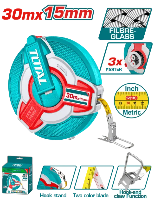TOTAL TMTF18306 Fiberglass Tape Measure – 30 m Professional Measuring Tool