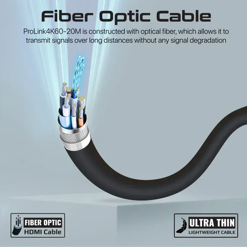 Enhance your viewing experience from the comfort of your living room with ProLink4K60-20M. Supporting resolutions up to 4K@60Hz, this unidirectional HDMI® cable provides crisp vibrant video quality without any lag or drop-off. The gold connectors deliver optimal signal transfer with lower distortion, while the 20-meter optical fiber cable allows signal transmissions over long distances without any degradation. The ethernet function on this HDMI® cable ensures you can share your Internet connection with multiple devices. Unlock a new and amazing visual experience with ease.