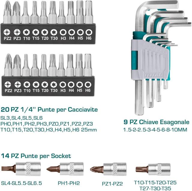 14 x Bit sockets: T10–T35, SL4–SL6.5, PH1–PH2, PZ1–PZ2