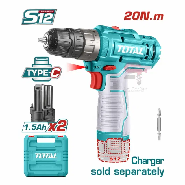 TOTAL 12V 1.5Ah Cordless Drill Model TDLI12202, TDLI12202 Lithium-ion Cordless Drill, Two-Speed Mechanical Gears, Built-in Work Light. The package comes with 2 x 12V 1.5Ah Lithium-ion Batteries and Charger, and 1 x 65mm Screwdriver Bit. All items are packed in a carrying case.