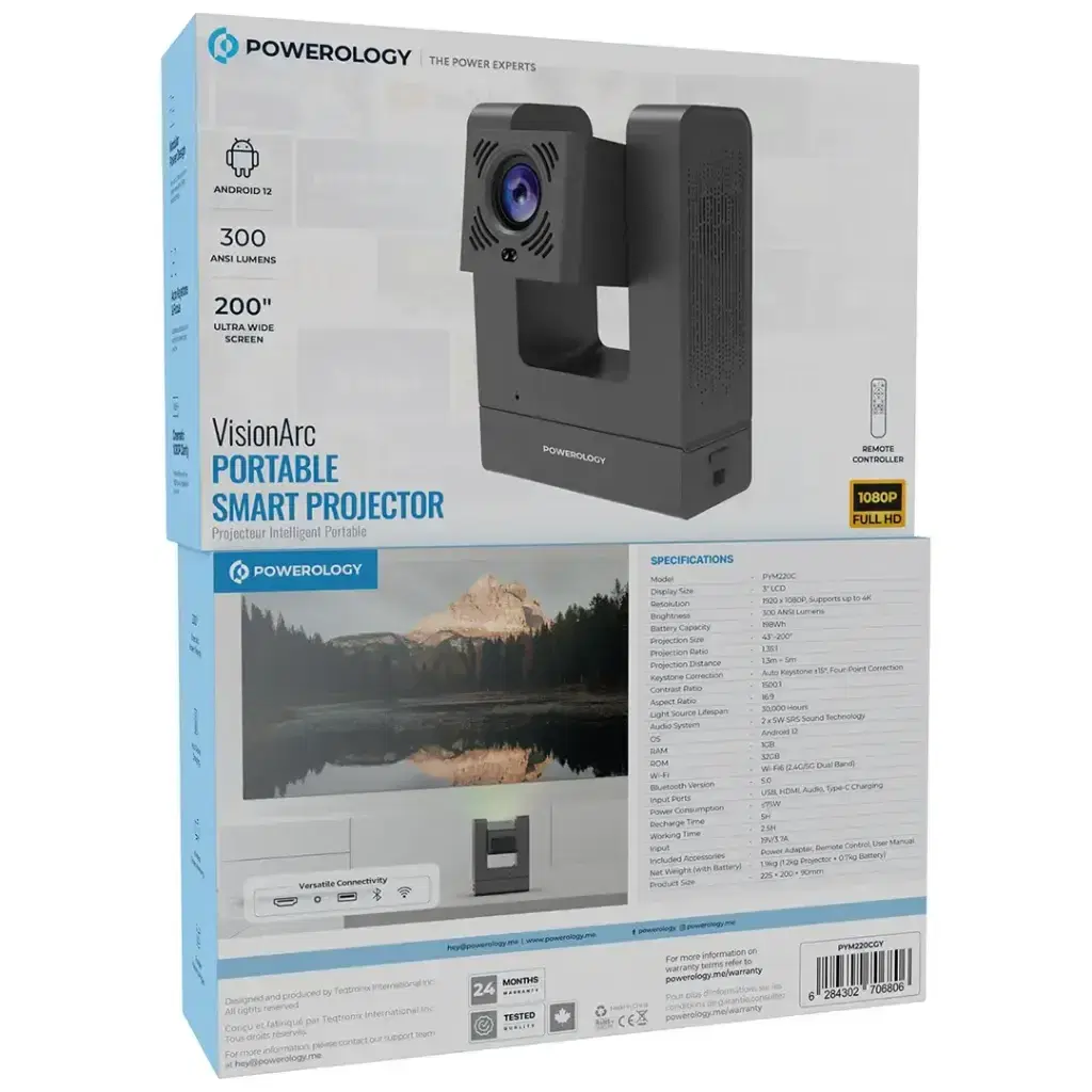 The Powerology VisionArc portable smart projector in gray brings the cinematic experience to your home or wherever you go. Featuring a 3-inch LCD screen with excellent 4K support and a maximum resolution of 1080p, and with 300 ANSI lumens of brightness, it's the perfect projector for vivid visuals. It covers all sizes from 43 inches to 200 inches, with a projection distance of 1.3 meters to 5 meters and a 1.25:1 aspect ratio. Automatic angle correction and four-point alignment ensure a perfectly aligned image. The projector runs on Android 12, has 1GB of RAM, and 32GB of ROM. It also supports Wi-Fi 6 and Bluetooth 5.0, making connectivity incredibly easy. Two 5W SRS audio drivers deliver clear sound, and the projector has a 192.96Wh battery, allowing for up to 2.5 hours of use on a single charge. With its versatile inputs (USB, HDMI, Type-C) and wireless screen mirroring feature, VisionArc is a great option not only for entertainment but also for professional purposes.
