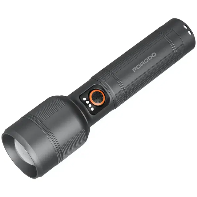 The Porodo Lifestyle rechargeable flashlight in gray is a must-have accessory that ensures excellent and reliable illumination in any situation. With a powerful 2200mAh battery and an impressive 1200-lumen output, this flashlight has a beam that can reach up to 500 meters. It features a Type-C charging port, allowing for a full charge in just 4 hours with 84 minutes of usable use. The flashlight also boasts a manually adjustable high-intensity beam setting, from illuminating a large area to spotting a distant object. The Porodo Lifestyle flashlight also offers multi-mode operation, making it easy to switch between different brightness settings, whether outdoors, at work, or in emergencies. It has an IPX5 rating, meaning it will withstand splashes and even rain, so its durability is undeniable. The Porodo Lifestyle flashlight is not only reliable but is also, in fact, one of the best-performing portable flashlights available; therefore, it is suitable for camping, hiking, and everyday use.