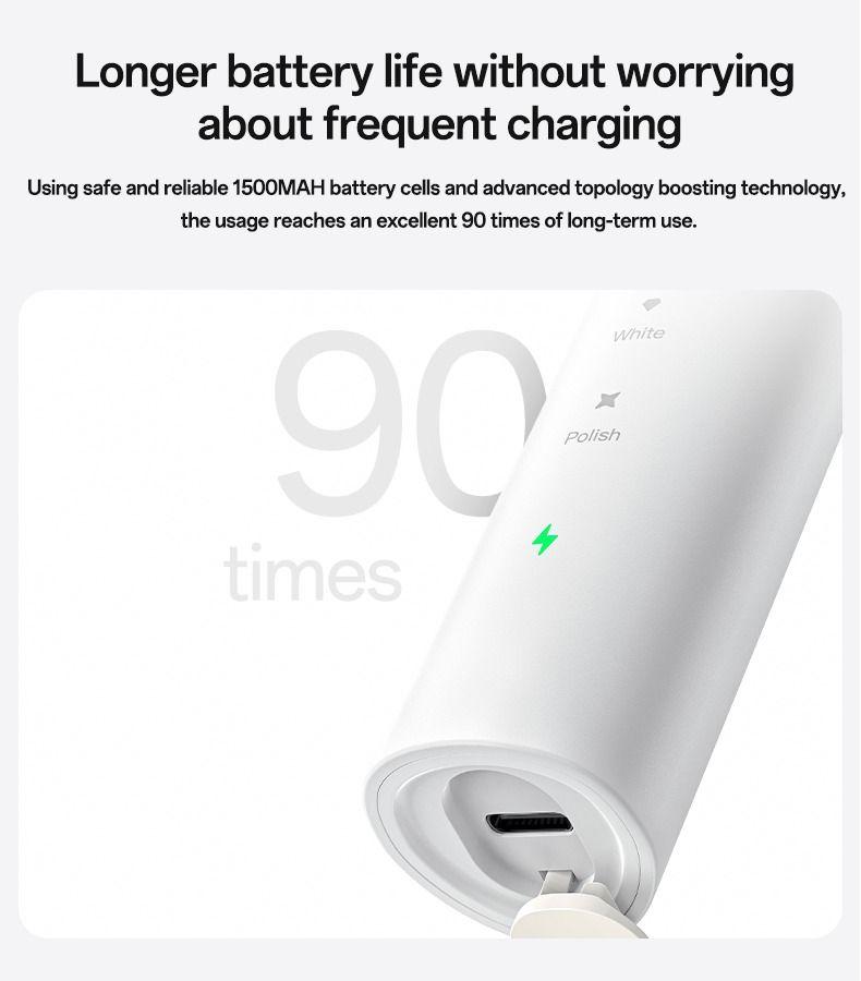 5 Smart Cleaning Modes: Choose the perfect mode for your teeth: Clean, Sensitive, Massage, White, and Polish.