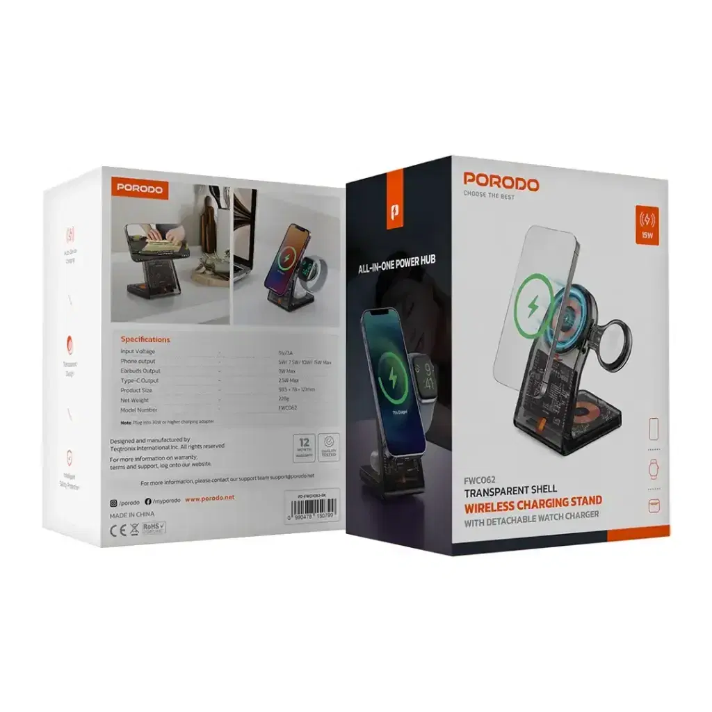 Porodo Transparent Shell Wireless Charging Stand gives your devices a refined, high-power charging experience. It features a modern transparent appearance that unites trendy appearance with new functionality. It charges your smartphones at speeds up to 15W wirelessly with adjustable outputs of 5W, 7.5W, 10W, and 15W, while your earbuds are charged with a 3W output along with a 2.5W Type-C output. Designed with multi-device charging, this product allows you to charge your earbuds and phone simultaneously with maximum efficiency. Integrated intelligent safety protection prevents overheating, overcharging, and short circuits of your devices with a safe and reliable power supply. This charging stand features a 9V/3A input voltage and a fast and stable charging experience. Perfect for homes, workspaces, or travel accommodations, the Porodo Transparent Shell Wireless Charging Stand is a harmonious integration of functionality, beauty, and smart protection for your everyday charging needs.