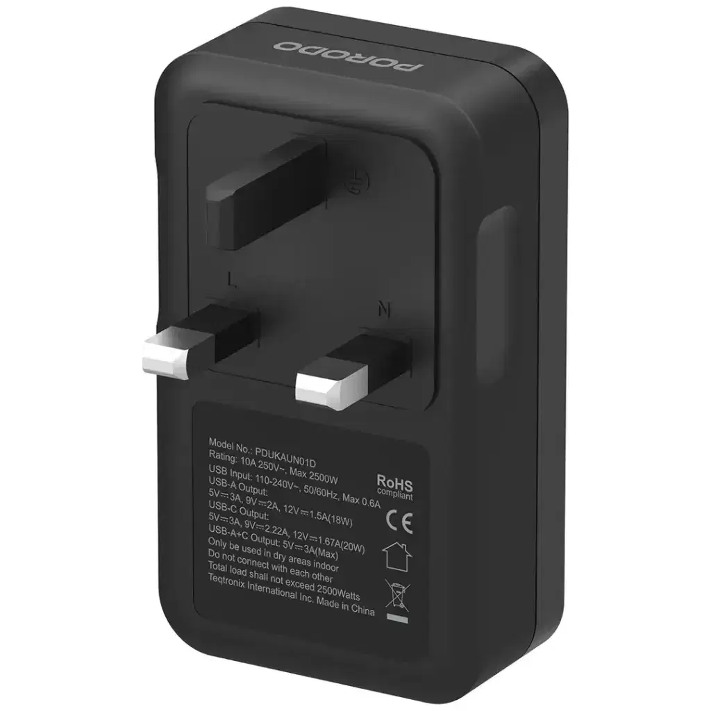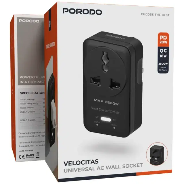 The Porodo Velocitas Universal AC Wall Socket packs a powerful performance into a small package that perfectly fits the multi-device and fast charging solution. It allows the simultaneous charging of several devices with different needs thanks to the USB-A and USB-C outputs. The power rating of 2500W guarantees that the power delivery is very effective, and the UK 3-pin plug makes it possible to use the socket in UK electrical points. This socket's quick charging features and the universal AC socket make it a perfect partner for home and travel. It even comes with an operating temperature range that is as wide as that of 0 to 40°C, which means it can still deliver a reliable performance in different conditions. No matter if you are at home, in the office, or on the go, Porodo Velocitas AC Socket offers you a smart way to charge all your devices and keep them powered up.
