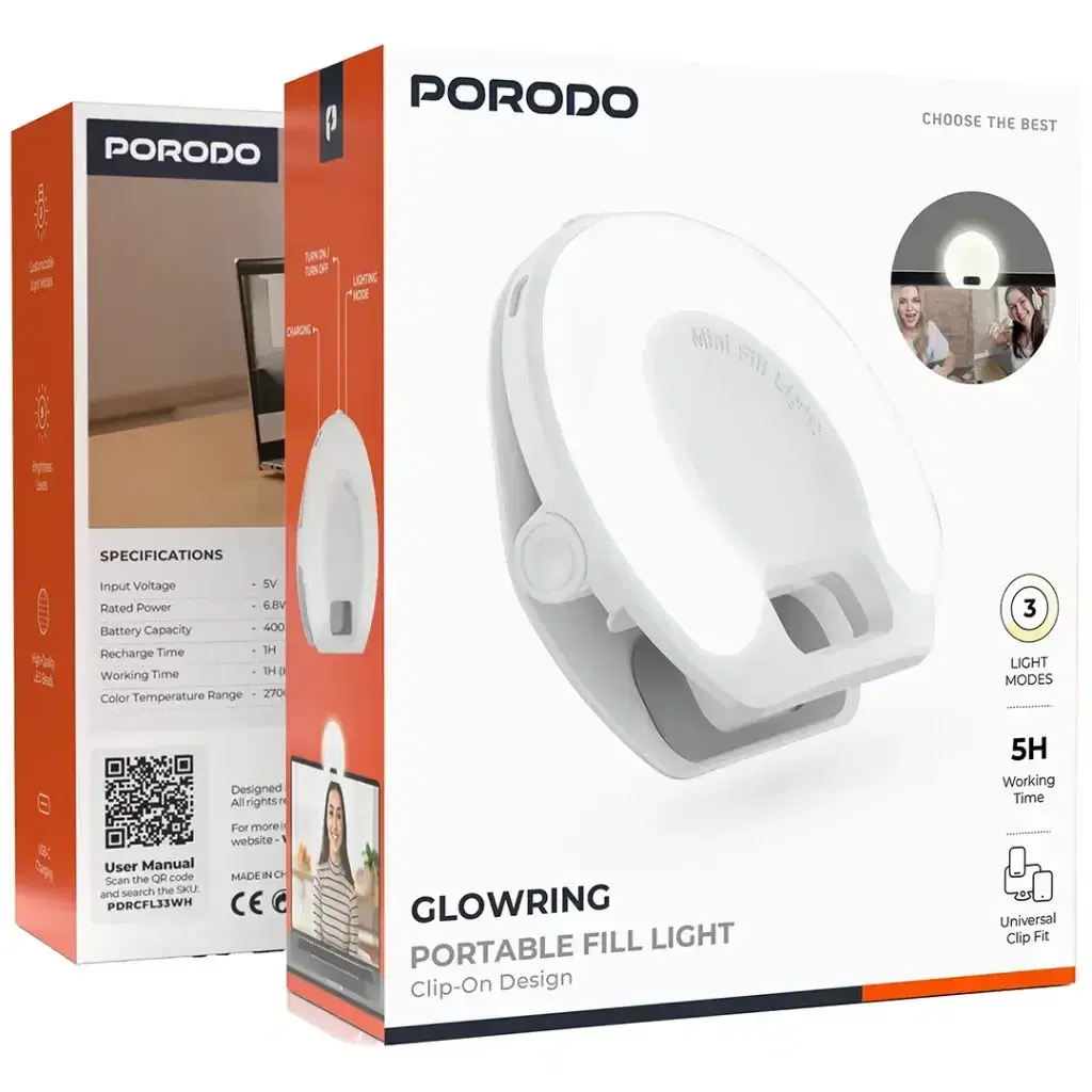 The Porodo Glowring Portable Fill Light is a miniaturized and adaptable light source that is primarily meant for content creators, but it can also be used by professionals and those who need a lighting source that they can easily carry around. This little light has different light modes, which are: White, Warm, and Natural, and it can easily modify itself according to the place you are in, be it a recording of a video, a virtual meeting, or just an addition of light to your work area. The top-notch LED beads provide a bright and even illumination, and the universal clip makes it easy for you to attach them to your laptop, tablet, or smartphone. The USB-C charging aspect offers quick and effective recharging, and with a maximum of 5 hours in low mode, you can have light that lasts for a long time on your trips. The Porodo GlowRing is an excellent choice for home-based work, streaming, and any other situation requiring a portable light source, as it combines great performance and a modern, compact design.