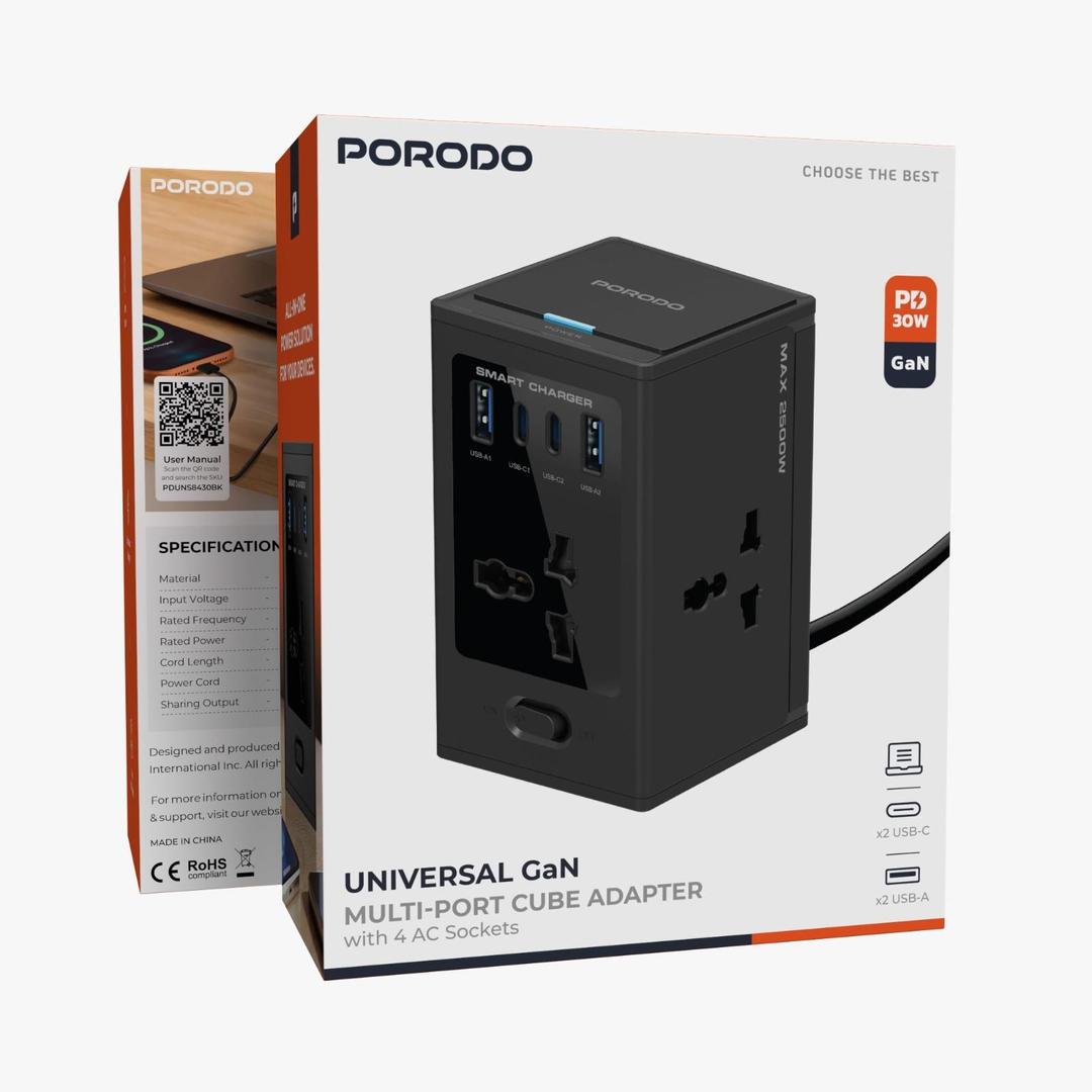 Porodo PDUNS8430BK Universal GaN Multi-Port Cube Adapter with 4 AC Sockets
