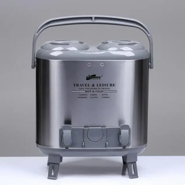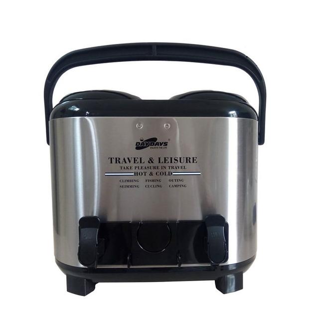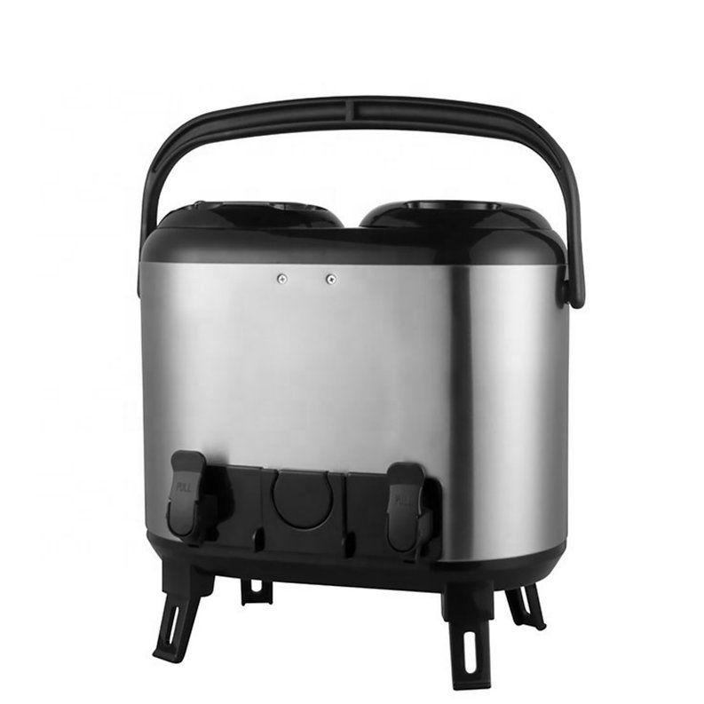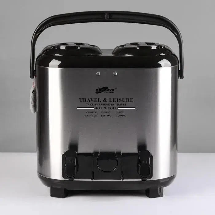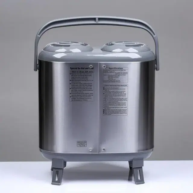 Double stainless steel flask with a capacity of 7.5 liters + 7.5 liters, with a cup holder for drinks