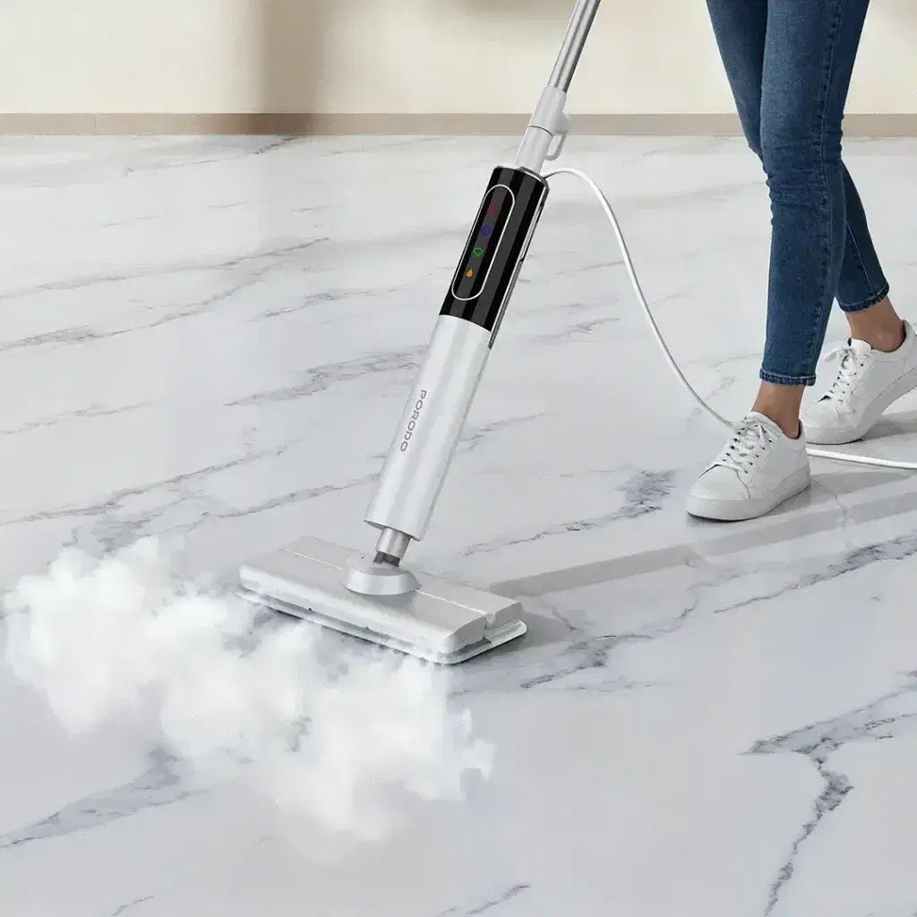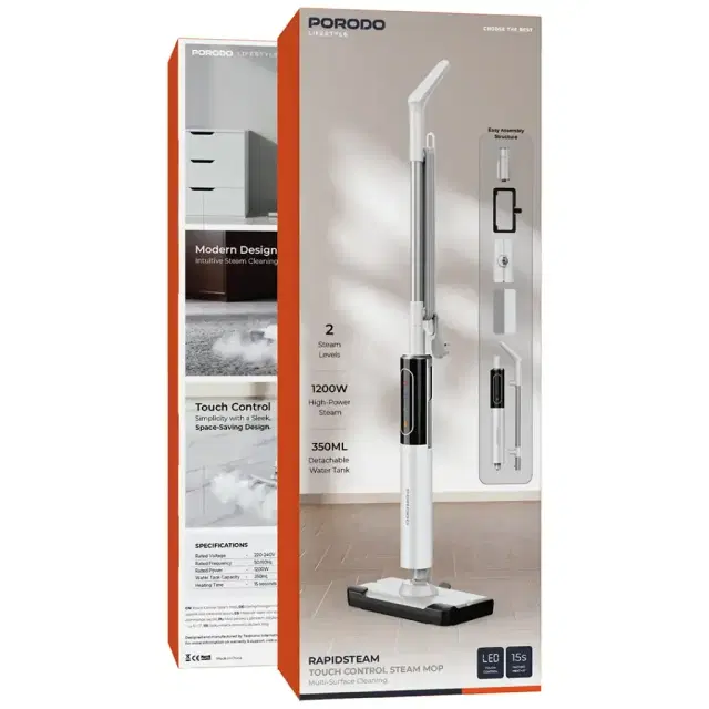 The Porodo Lifestyle RapidSteam Touch Control Steam Mop - White provides an effective steam cleaning solution that delivers high-powered steam cleaning for residential use. The device delivers instant heating capabilities, which enable users to start cleaning their home surfaces within 15 seconds of activation. The system uses 1200W of steam power to remove dirt and grime while users can continue working because the system includes a 350mL detachable water tank. The mop provides two steam levels, which enable users to clean different surfaces that require either light dusting or deep sanitizing. The user can operate the system with touch control, while the system provides complete cleaning coverage, which prevents any area from being missed. The product enables fast installation through its simple assembly design, while its flame-retardant ABS material guarantees both product strength and user protection. The device includes a breathing light indicator that shows the user when it is ready for operation. The mop provides users with a quick and effective cleaning solution, which enables them to keep their home environment completely clean.