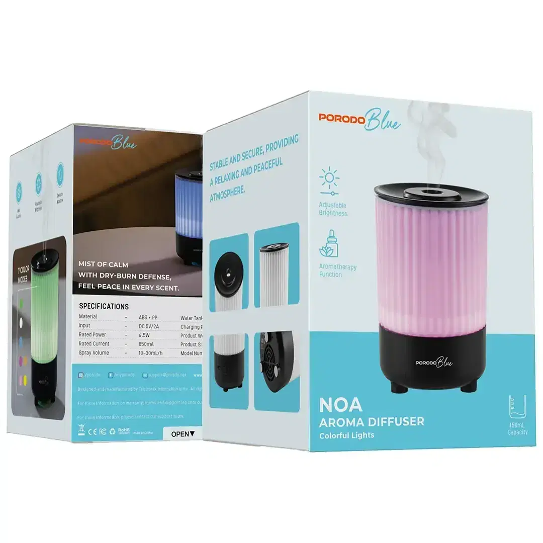 The Porodo Blue Noa Aroma Diffuser with Colorful Lights - Black creates a serene atmosphere that enhances the peacefulness of your home or office space. The device offers seven different color settings, along with brightness control, allowing users to create their preferred environment for relaxation or work. You can experience your preferred scents through the aromatherapy function, which operates while the diffuser distributes its fine mist throughout the space. The dry-burn defense ensures safe operation, while the USB-C charging port makes it easy to keep powered up. Its compact design allows for easy placement on any desk or table. The NOA Aroma Diffuser uses its 150mL water tank to produce continuous soft light and calming scents, which create a peaceful environment for users to experience their most comfortable state.