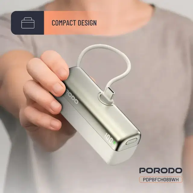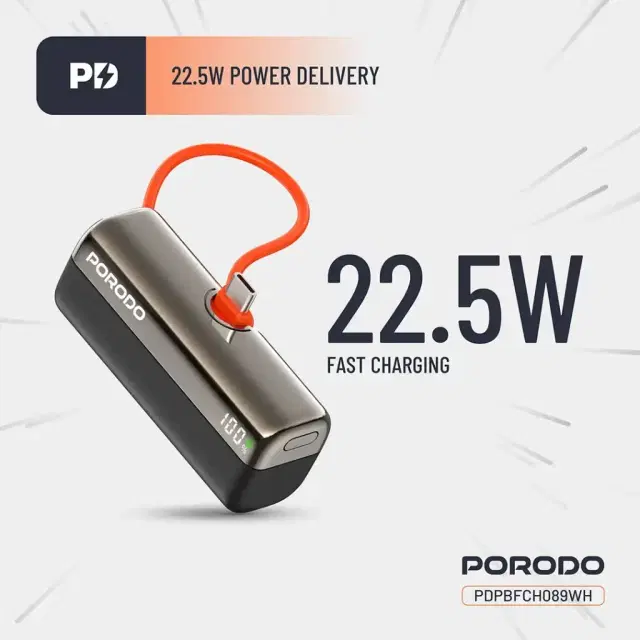 The Porodo Pocket Volt is a high-charging product that is compact and portable. It carries the conflicting reputation of being a power bank with a capacity of 5000mAh. This power bank allows fast charging with a Type-C input/output of 5V/3A, 9V/2.22A, and 12V/1.67A; max 20W output. This Type-C cable adds some charging versatility and supports up to 22.5W max-fast charging, good enough to quickly charge smartphones and tablets. It has a 15W max total output, capable of charging various devices simultaneously. The Porodo Pocket Volt Power Bank is so compact and thin that it will probably fit perfectly into your bag or even into your pocket. That makes it just right for travel or for carrying around during the day. The Porodo Pocket Volt Power Bank with PD 22.5W helps you stay fully charged in those critical moments when you can't afford to run out of power.