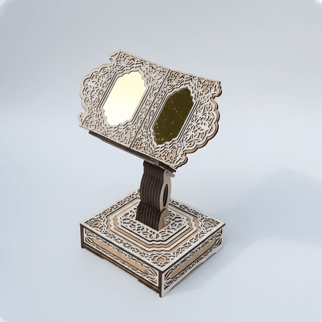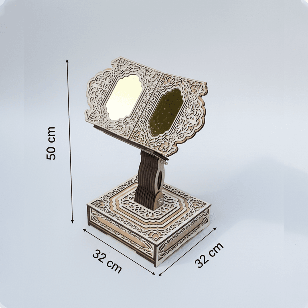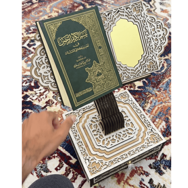 The perfect gift for your parents and loved ones. You can also dedicate it as a charitable endowment (waqf) in your name and on behalf of your parents in mosques and prayer rooms. It features a modern and beautiful design with a distinctive aesthetic appeal. It includes a storage drawer for your reading glasses or personal belongings. A uniquely designed wooden bookmark allows you to easily see your reading progress. It is equipped with wheels for easy movement. The height is easily adjustable to suit your posture, whether sitting on a chair or on the floor.