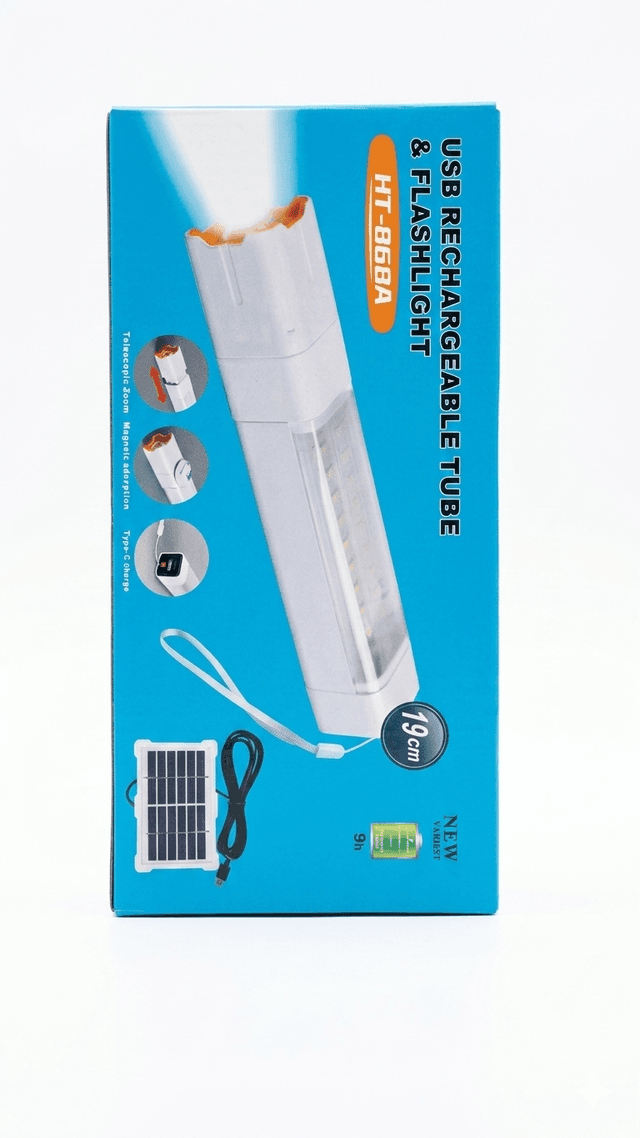 USB rechargeable tube flashlight HT-868A Type C & solar charging capabilities.