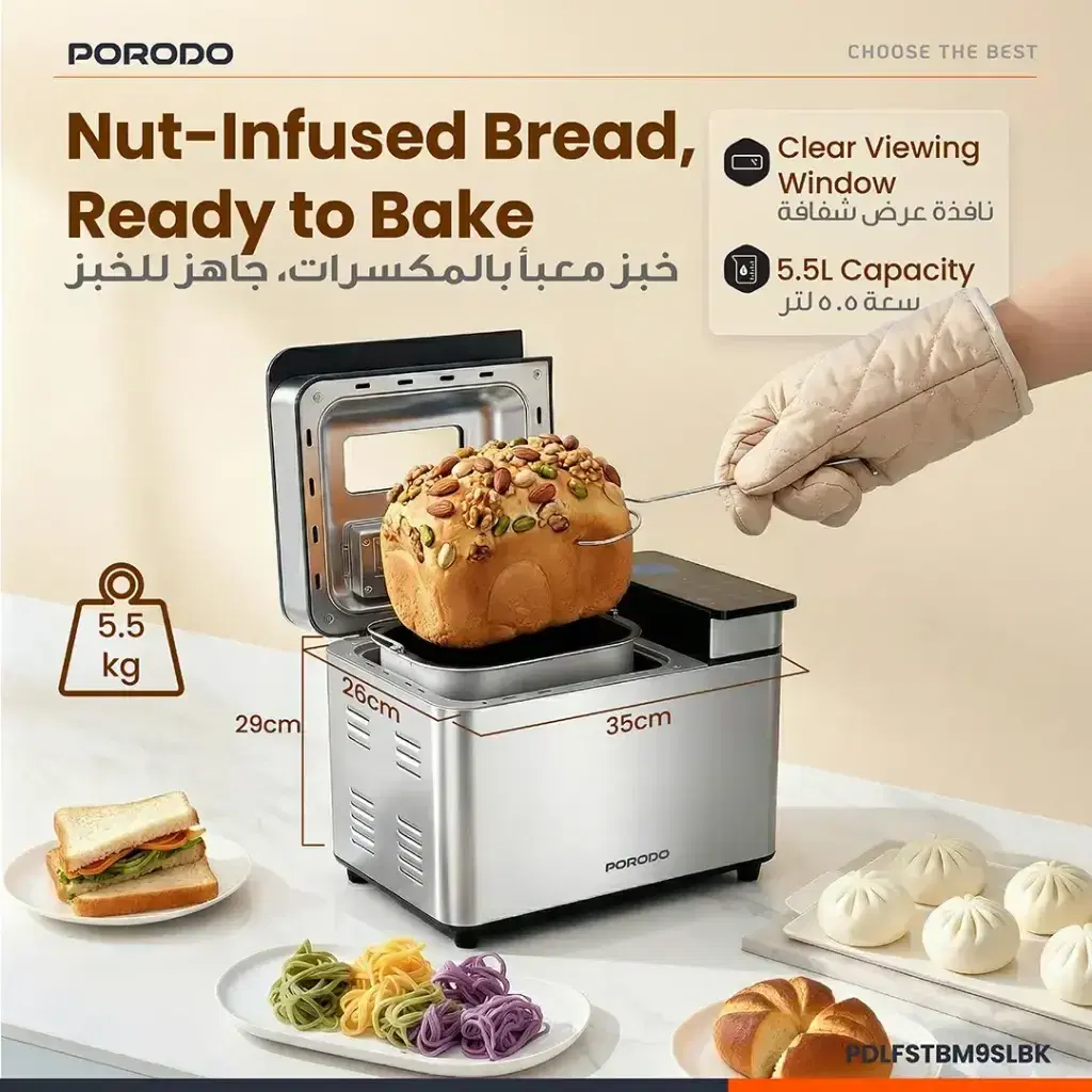 Porodo PDLFSTBM9SLBK Khabaz Stainless Steel Automated Bread Maker with 25 Preset Programs