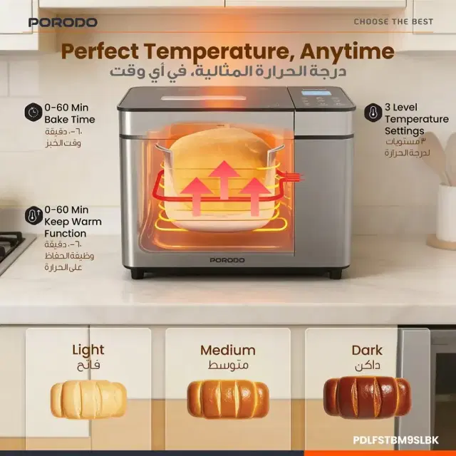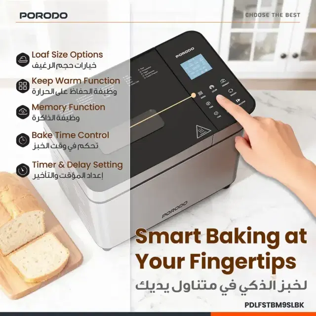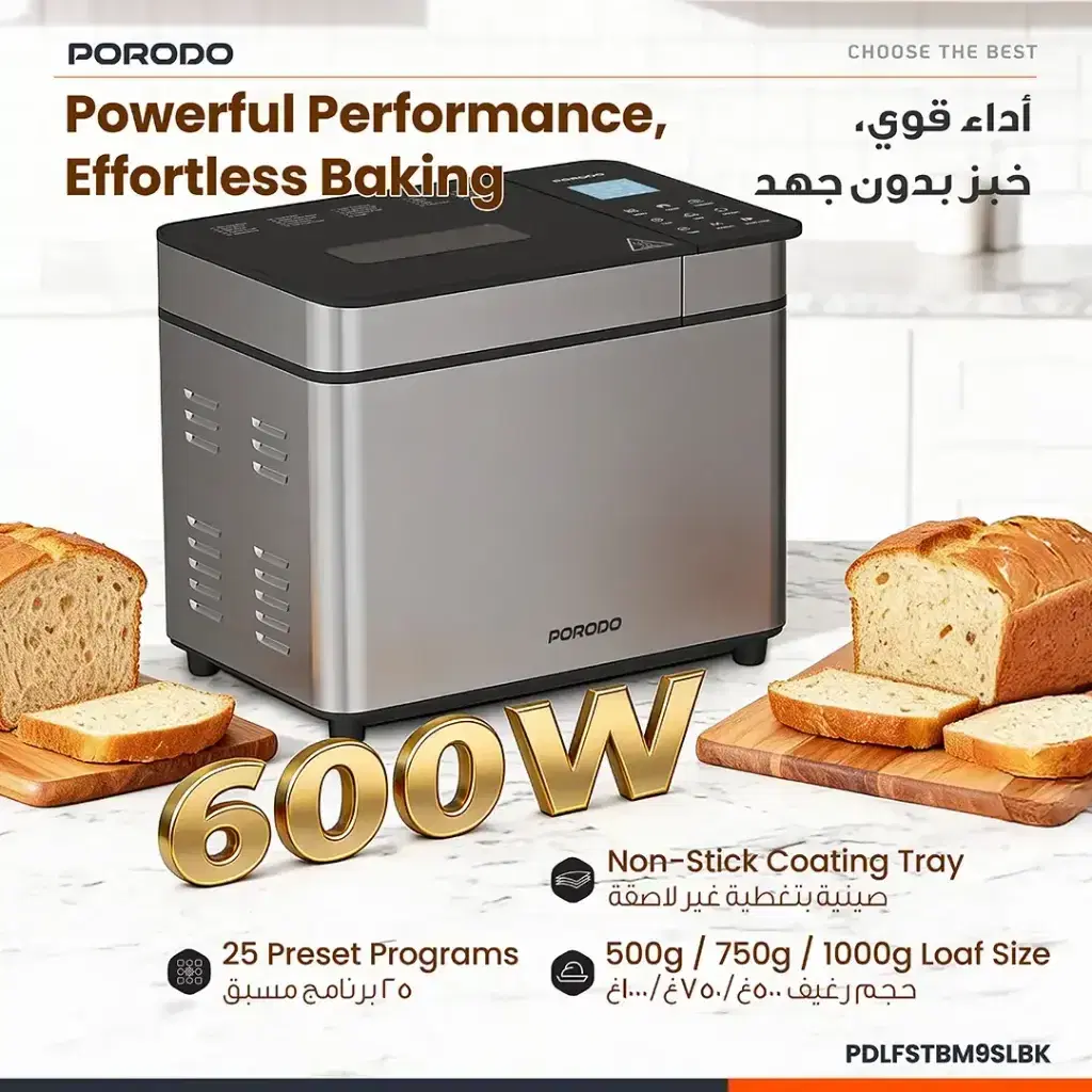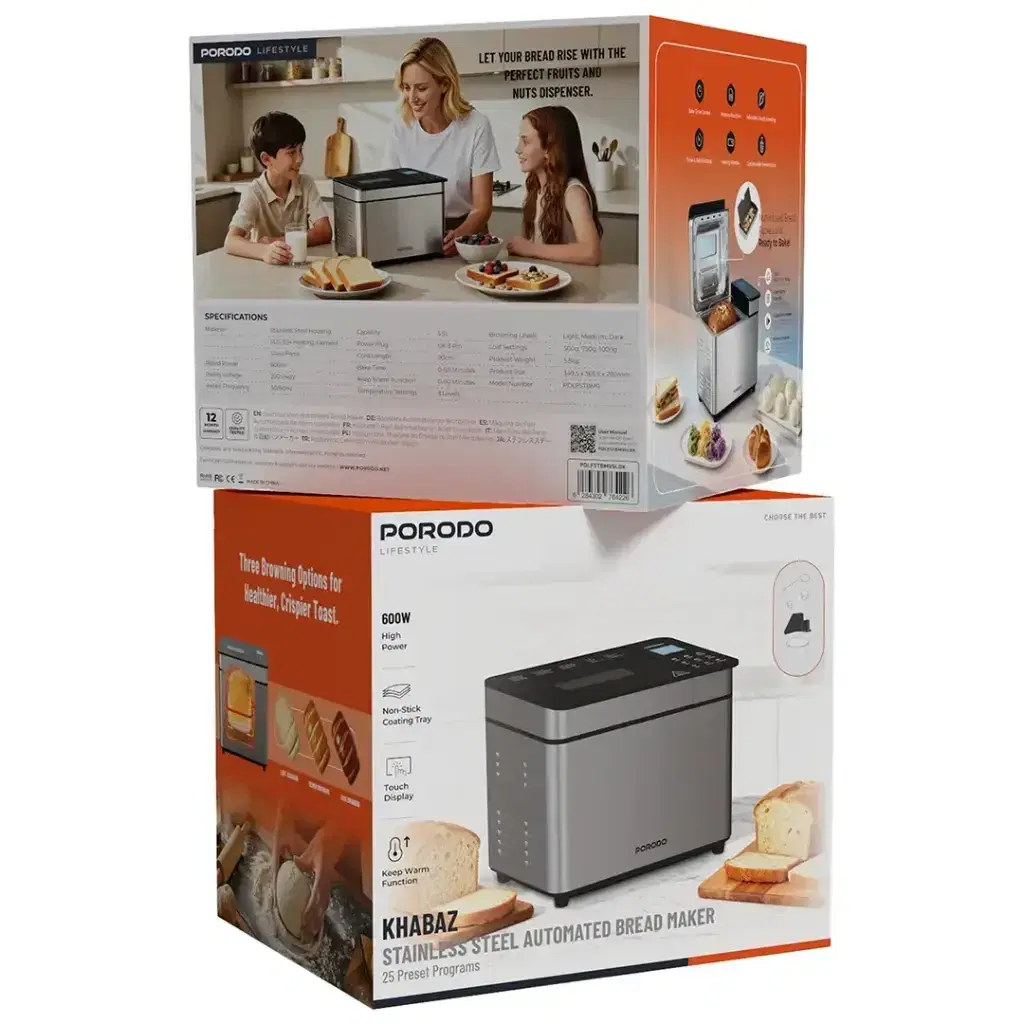 The Porodo Lifestyle Khabaz Stainless Steel Automated Bread Maker with 25 Preset Programs - Black provides an easy and convenient way to bake fresh, delicious bread at home. The baking system includes 25 built-in baking programs, which allow users to create their desired bread recipes through the combination of different baking settings. The non-stick coating tray enables quick cleaning after each use, while the Teflon-coated baking tray delivers uniform baking results. Choose between 3 browning options for your toast: light, medium, or dark, and enjoy the keep warm function to keep your bread fresh after baking. The adjustable dough kneading feature enables you to achieve the ideal dough consistency, which is essential for successful baking. The system offers users a customized experience through its fermentation options and touch display. The bread maker includes a timer and delay setting, which enables you to schedule your baking process with perfect accuracy, making it an essential appliance for both dedicated bread makers and those who enjoy home-baked bread.