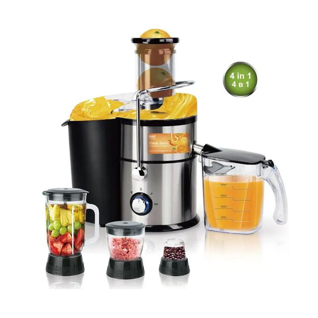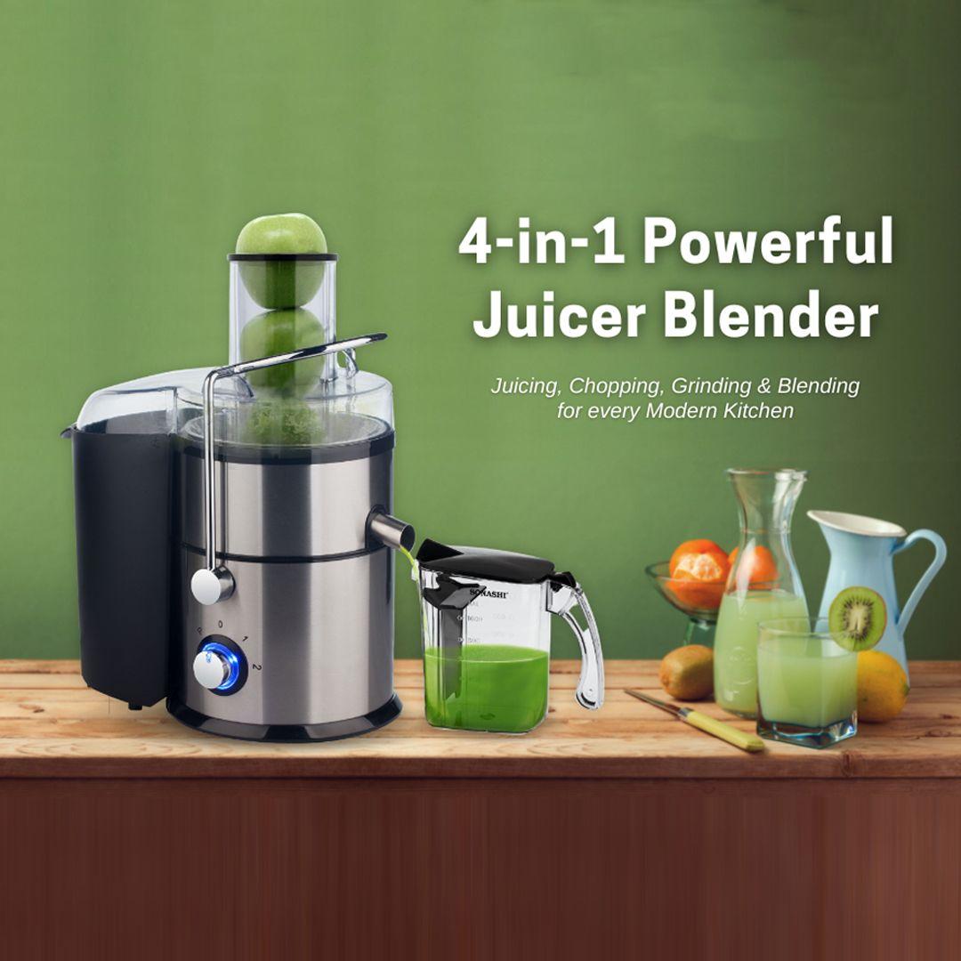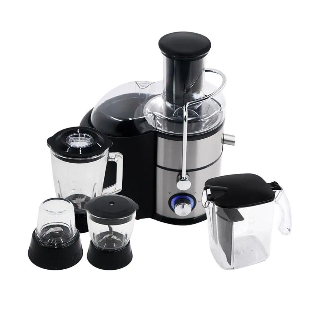 It comes with a strainer, safety lock, grinder, slicer, and glass blender.