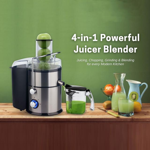 It features a stainless steel filter with a dedicated juice outlet.