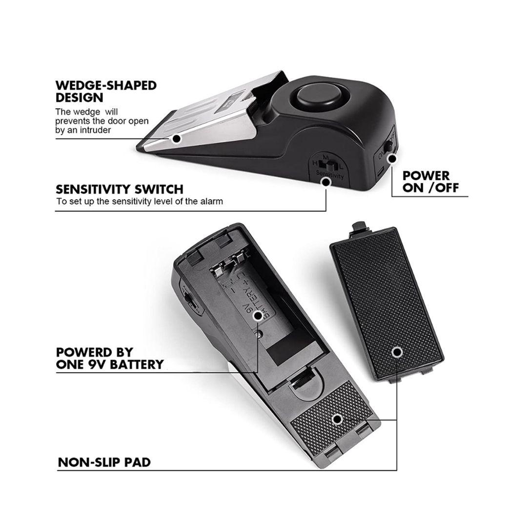 - Easy and effective protection: Installs behind any door and emits a loud alarm when the door is opened.