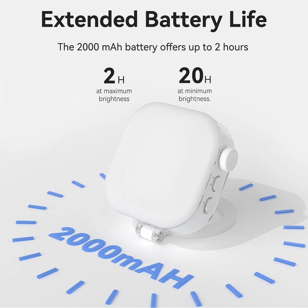 Equipped with a 2000mAh rechargeable battery, it lasts up to 2 hours on maximum brightness and recharges quickly with a Type-C port.