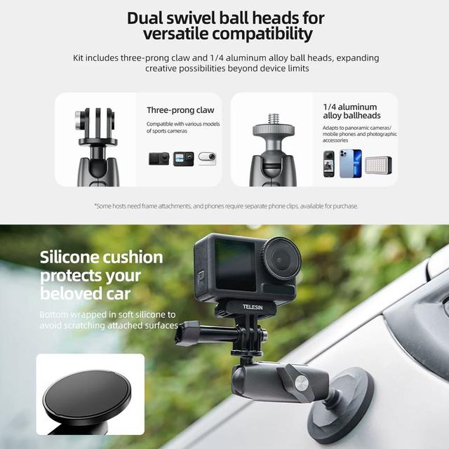 Includes a 3-prong mount and a 1/4" screw head, making it suitable for action cameras and compact cameras like GoPro, Osmo, Insta360, and more.