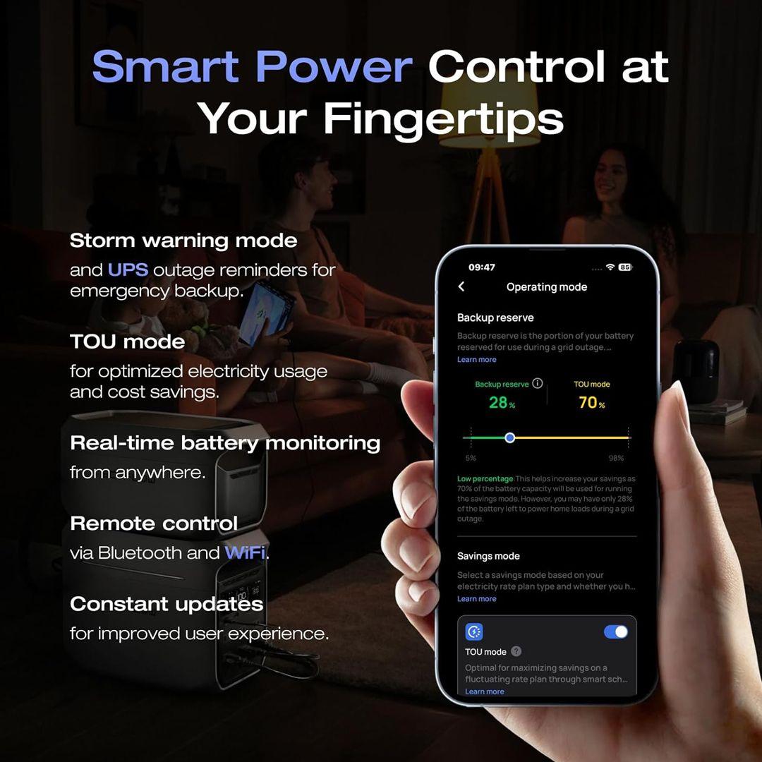 Smart control at your fingertips – The EcoFlow app provides storm and outage alerts up to 12 hours in advance, shows real-time usage, and lets you set custom charging schedules. The upgraded TOU (Time-of-Use) mode automatically calculates savings and optimizes charge/discharge cycles to cut your electricity bills.