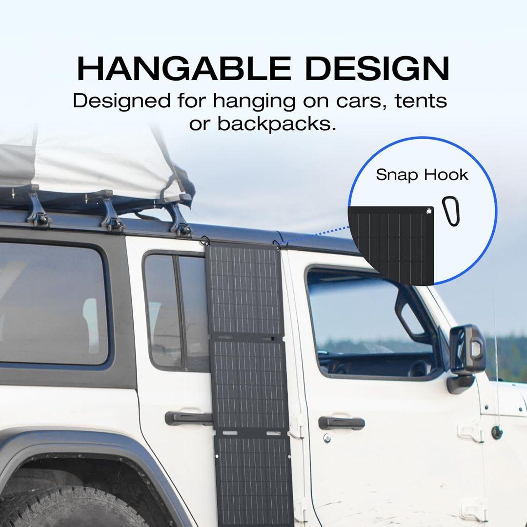 Not only can you lay it flat on the ground or tilt it on a stand, but the foldable panel can also be hung using the four built-in eyelets and included hooks. Hang it on your car or backpack and charge while you move to your next destination.