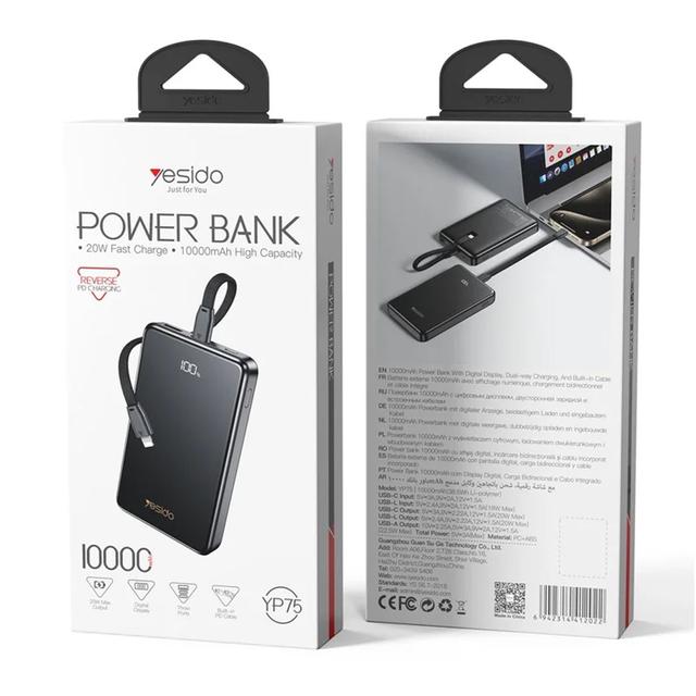 Power Bank Yesido YP75 10000mAh Capacity Digital Display 22.5W Fast Charging with Built-in Lightning Cable