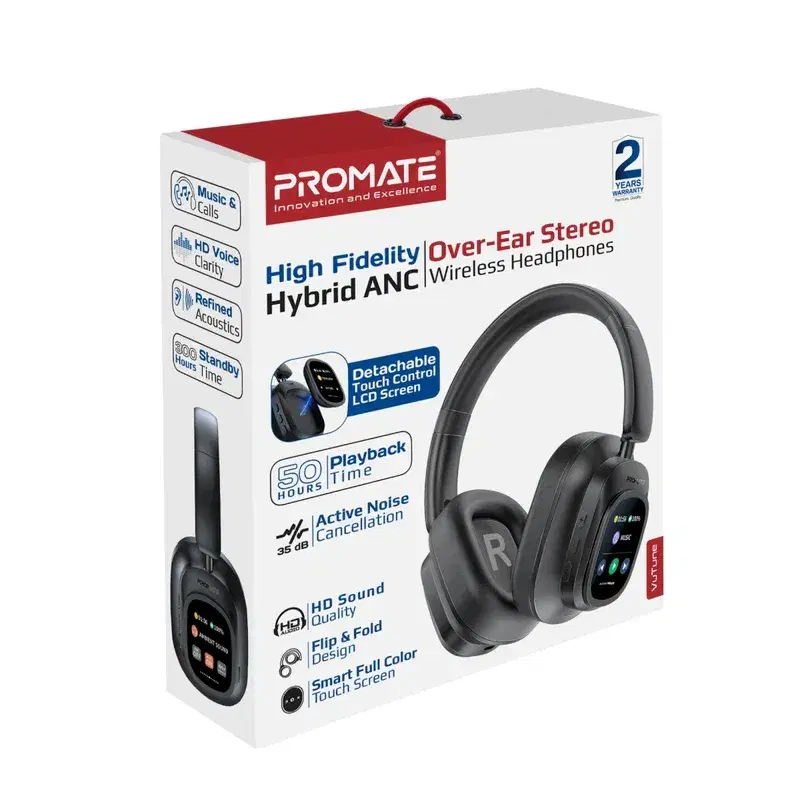 Experience unparalleled audio sophistication with Promate’s VuTune, featuring a groundbreaking detachable magnetic LCD touch screen controller. This incredible innovation offers effortless, intuitive control right at your fingertips, revolutionizing your listening experience. Coupled with high-definition sound, hybrid active noise cancellation, and up to 50 hours of playtime, VuTune ensures premium performance whether you're on the go or relaxing at home. The stainless steel adjustable headband, ergonomic earpads, and foldable, rotatable design provide maximum comfort and convenience, while the Type-C charging port ensures quick power-ups. Embrace a new era of audio with VuTune’s state-of-the-art features.