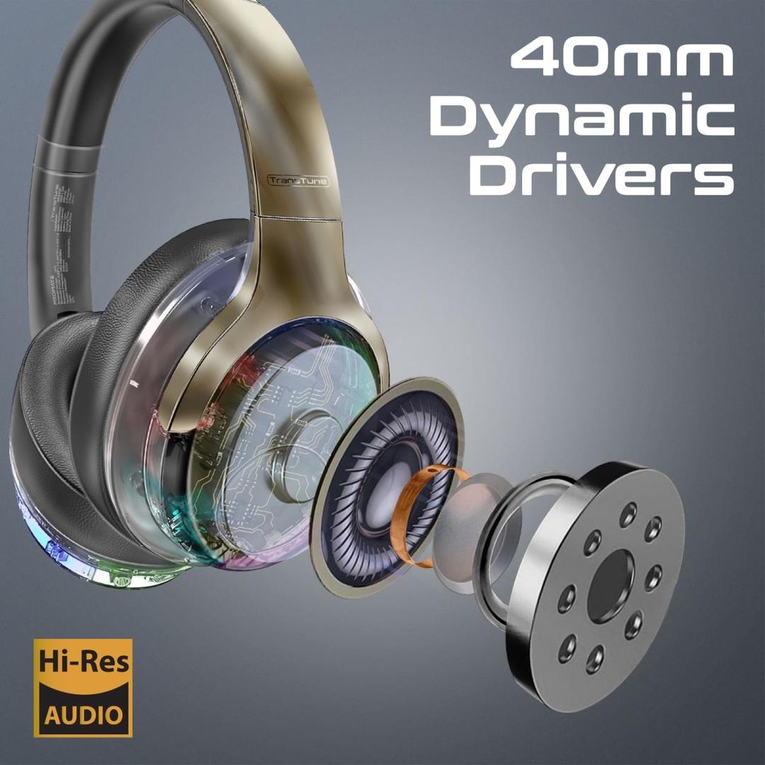 Experience magnificent sound quality and set out on a sparkling musical journey with TransTune. Housed in a stunning transparent design and colorful RGB lights these ANC, wireless headphones, illuminate your listening experience. Boasting a 40-hour playback time and 40mm dynamically tuned drivers, TransTune is the ultimate over-ear headset. Enjoy the convenience of crystal-clear hands-free calling with the integrated microphone and built-in button controls. The AUX support ensures your tunes don’t stop and the soft earpads ensure maximum comfort so you can groove to the music all day long in style.