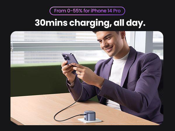 Multiple Fast Charge Choices: The 30W GaN USB C Charger supports PD 3.0/2.0 QC 4.0/3.0/2.0 PPS and BC 1.2 fast charge protocols, and charges most devices at a quite fast speed; Upgraded with a 30W output so you can charge your phone, tablet, earbuds, and even your MacBook Air with such a tiny charger