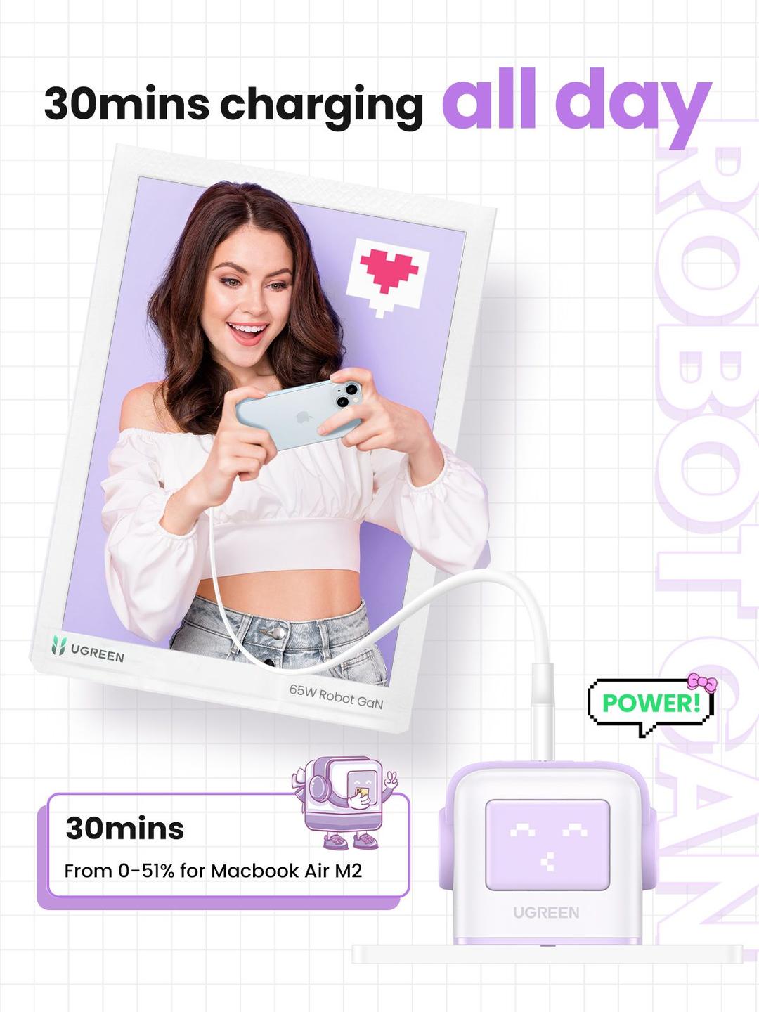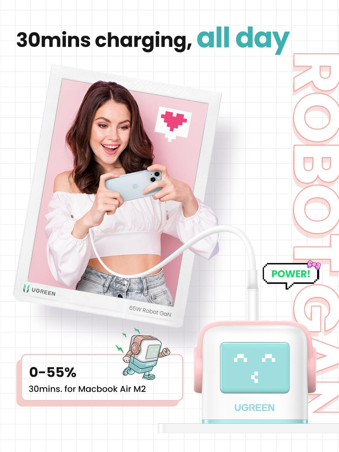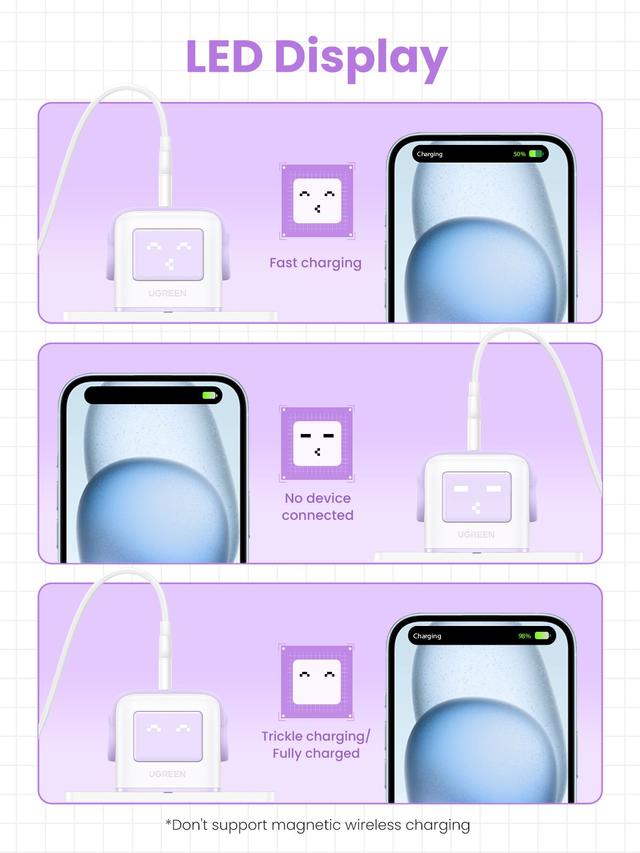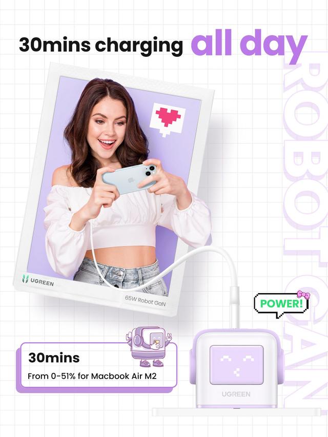 Robot Design, make charging more fun: UGREEN Uno Charger 65W has 2 USB C ports and 1 USB A port, which can fast charge your phone, tablet and other devices, and USB-C laptop from a single charger port. The unique,cute robot design makes the charging different. Powerful and Fast 65W Charging: This GaN charger can charge your MacBook Air M2 from 0 to 51% in just 30 min with single USB-C port, and when you use single USB C port or combination USB C and USB A port, it will provide you a maximum total output of 65W. LED Display of Charging Status: The face of the small robot wall charger is an LED display, which shows the charging status in real time when charging is in progress or when it has finished charging, please note that the LED display will only light up when plugged into the power strip. Wide Compatibility: This robot charger block is compatible with iPhone 15, 15 Plus, 15 Pro Max, 15 Pro, 14, 14 Pro Max, 13, MacBook Air M1, Watch 8, 7, HomePod, iPad Pro/Air/mini; AirPods Pro; Pixel 7, 6, Galaxy S24 Ultra, S23, A53, A52, Tab A8,A7, S8 and more. Multiple Safety System: 65W USB C power adapter equipped with built-in short circuit protection, overcharge protection, overheat protection and surge protection, ready for total safety.