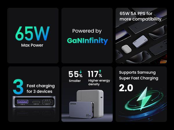 Triple Powerhouse: Charge 3 devices simultaneously via 2 USB-C & 1 USB-A ports, intelligently distributing 65W total power for optimal charging.