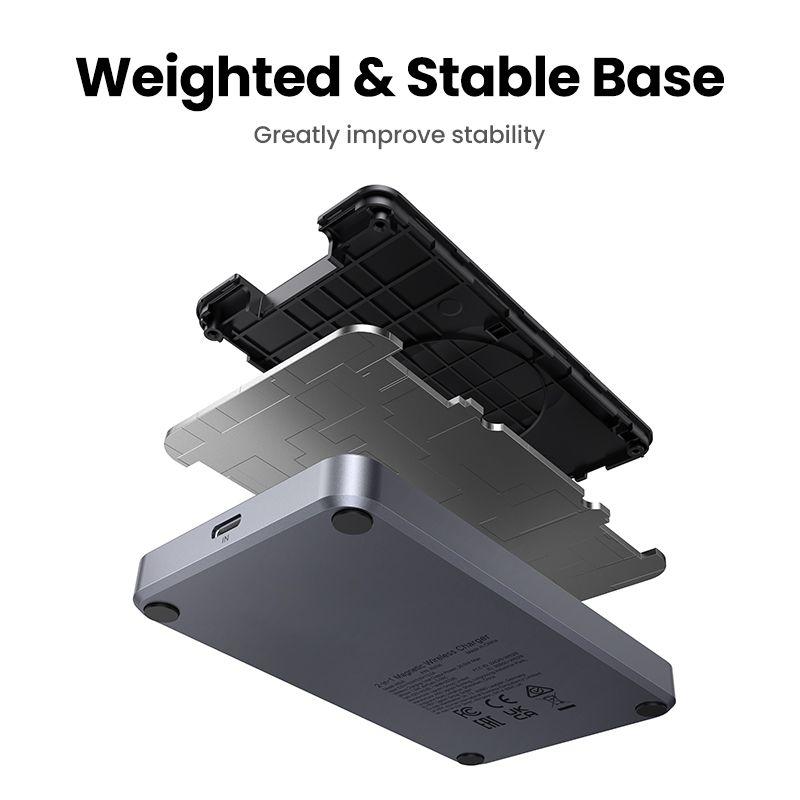 (2 in 1 unit *Wireless Charging) The UGREEN MagFlow wireless charger allows you to charge 2 iPhone and AirPods simultaneously at the same time. MagSafe compatible charger, charging speed as original Apple charger No need for messy charging cables, just place it on and charge it. The charging stand has 2 built-in coils, so it can be charged either vertically or horizontally, and can be charged while watching videos. Useful for everyday life and business