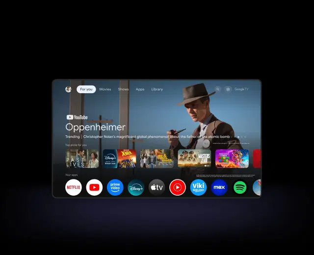 Google TV OS with voice search and curated content recommendations.