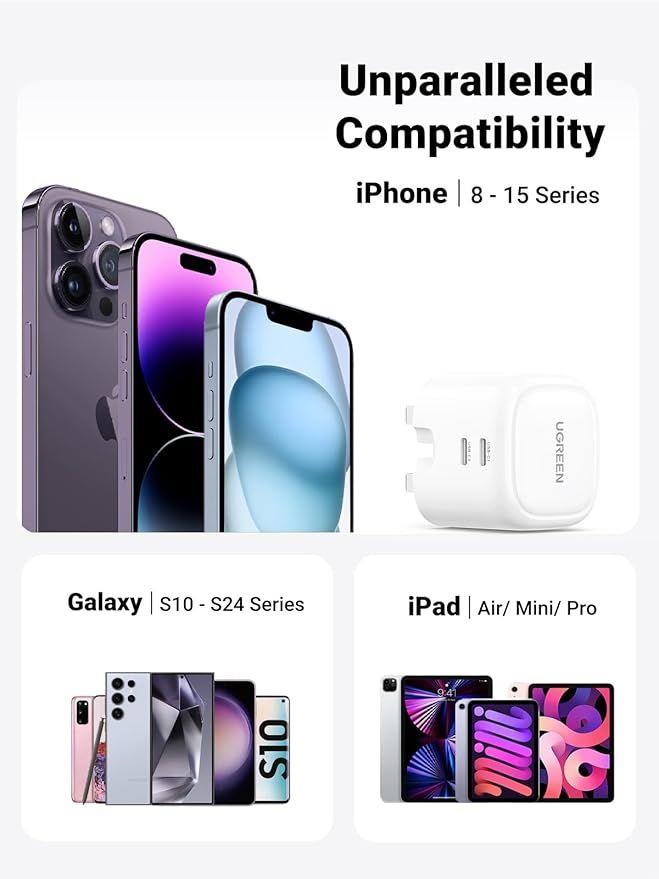 Swift and Efficient Charging: Experience the rapid charging power of UGREEN USB C Plug. Within 0.5h, iPhone 15 can be charged from 0% to 58%. Within 1h, the Samsung S24 can be charged from 0% to 80%