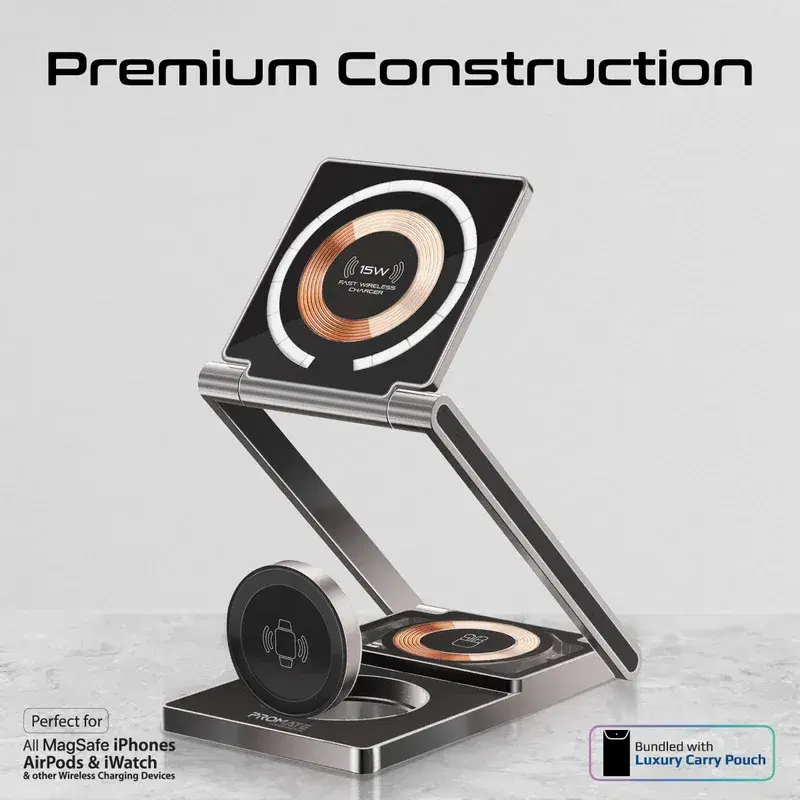 Introducing LucidFold-Trio, the ultimate 3-in-1 charging station designed to streamline your charging experience. Compatible with MagSafe technology, this innovative device features a 15W wireless foldable stand phone charger, a 5W wireless charger for AirPods, and a 3W wireless and foldable charger for Apple Watch, all in one sleek and transparent ultra-slim design. With Convenient Night light mode to set the mood, LucidFold-Trio adds flair to any space. The 1.2m cable provides flexibility in positioning, ensuring convenience and ease of use. Say goodbye to cluttered charging setups and embrace the future of charging with LucidFold-Trio.