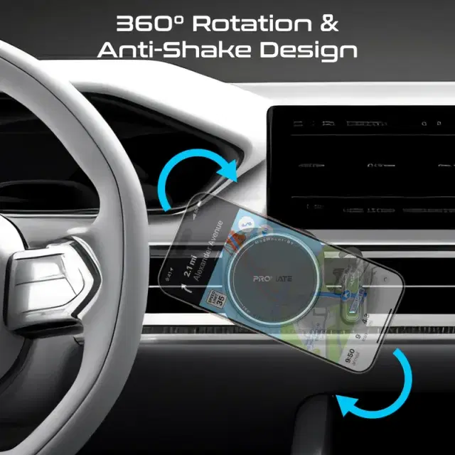 Elevate your driving experience with MagMount-BT by Promate, a 2-in-1 solution that combines a MagSafe-compatible 15W wireless charging car mount and a built-in wireless Bluetooth mono hands-free headset. Stay connected with crystal-clear calls and superior sound quality, thanks to ENC technology, while the one-touch earbud offers seamless hands-free convenience. Its quick, secure magnetic mount keeps your phone steady, even on bumpy roads, while the charging light ring adds a sleek, futuristic vibe. With 360° rotation, anti-shake design, and smart chip protection, this charging mount ensures safe, efficient power while keeping you in control on the go.