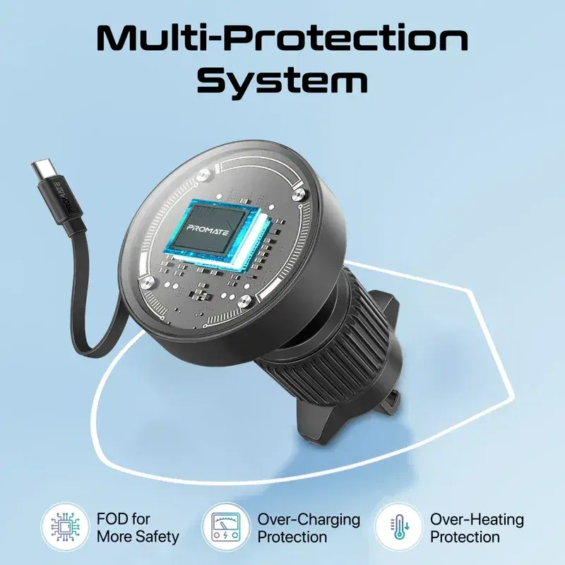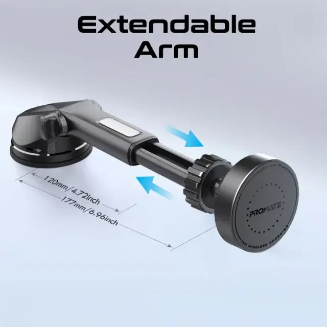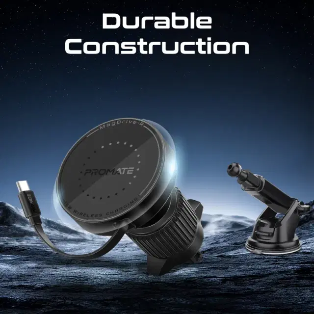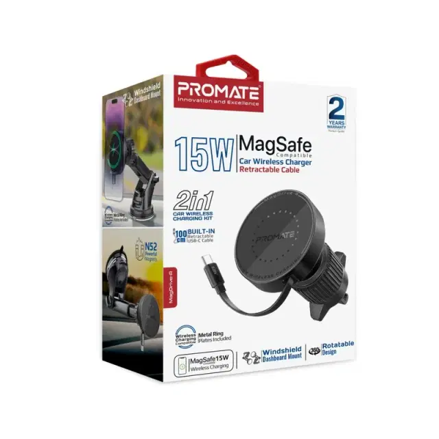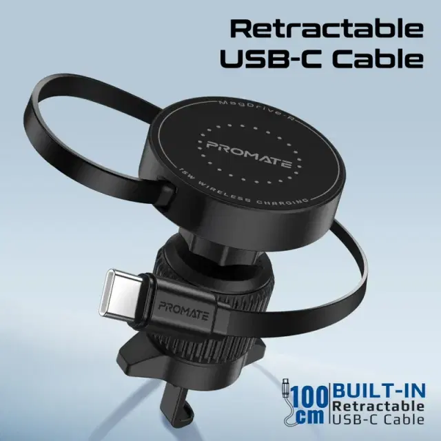 Unleash unprecedented driving convenience with the MagDrive-R, your ultimate 15W MagSafe compatible wireless-charging car mount designed for seamless on-the-go power. Whether mounted on your AC vent, dashboard, or windshield, its retractable USB-C cable can be conveniently adapted to your preferred length, ensuring a neat, clutter-free experience. Featuring quick and secure mounting with N52 rare earth magnets and an innovative anti-shake design, the MagDrive-R promises a steady hold and effortless 360° cradleless rotation for optimal viewing angles. Crafted from durable materials and built with advanced safety features like Foreign Object Detection (FOD), over-charging and over-heating protection, MagDrive-R redefines reliability and performance in wireless in-car charging. Drive with confidence and stay powered up, always.