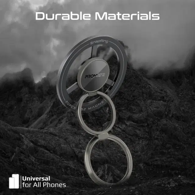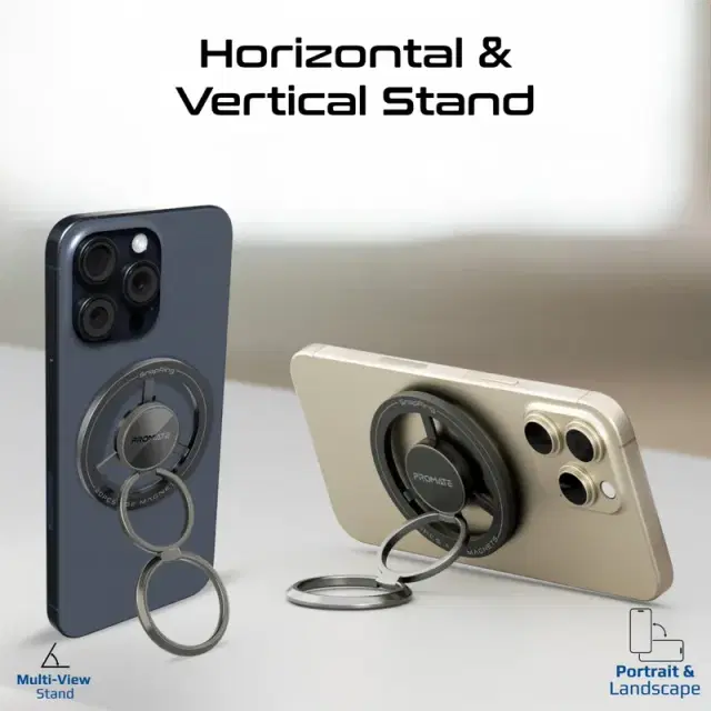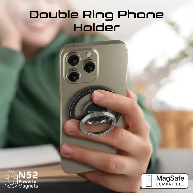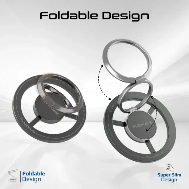 Elevate your smartphone experience with Promate’s SnapRing, a versatile, magnetic double ring phone holder designed for ultimate versatility and convenience. Engineered with MagSafe compatibility, this sleek, foldable holder snaps on to your device and then effortlessly transitions between being a horizontal or vertical stand, providing multi-angle 360° free rotation for unparalleled viewing flexibility. The adjustable dual axes and foldable design ensure compact portability, while the satisfying rotation clicking sound is an audible and tactile delight. Featuring a mirror surface center and crafted from durable materials, SnapRing merges style with functionality, making it the perfect companion for any mobile lifestyle.