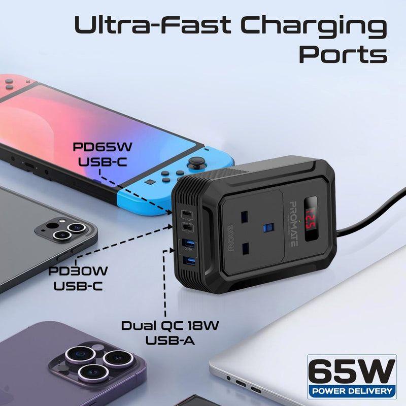 USB‑C1: 5V/3A, 9V/3A, 12V/3A, 15V/3A, 20V/3.25A (~65 W)