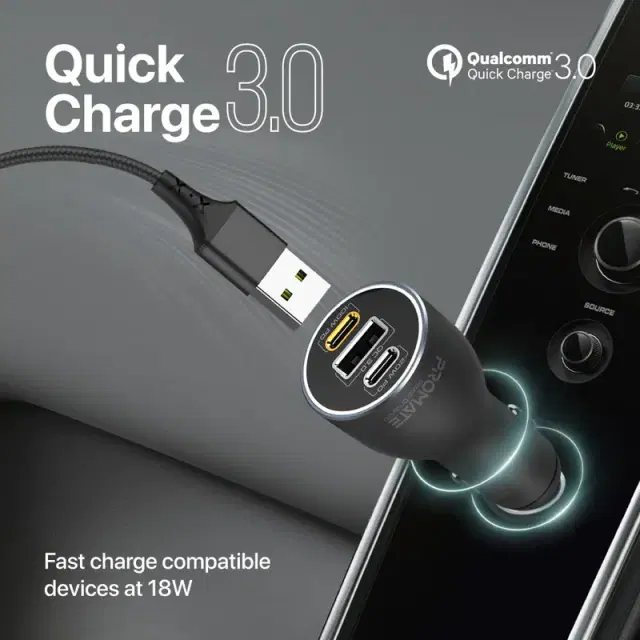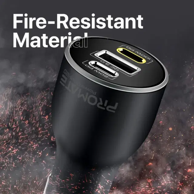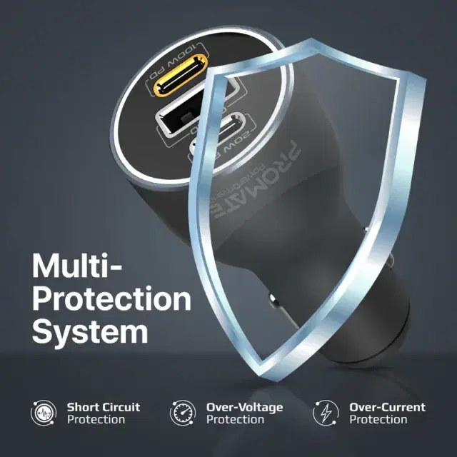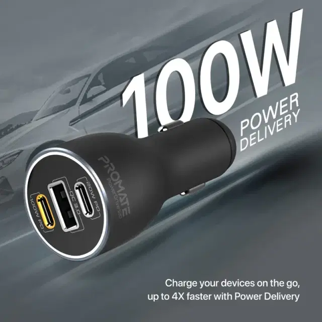 PowerDrive-120 is a powerful, car charger that has dual USB-C ports with 100W and 20 Power Delivery along with an 18W Quick Charging 3.0 port. This multi-device car charger can rapidly charge your power-hungry devices like laptops, tablets, smartphones, etc. on the go. The integrated protection chipset prevents short circuits and overcharging. A fire-resistant material ensures the safety of your device. Enjoy SuperSpeed charging for every adventure.