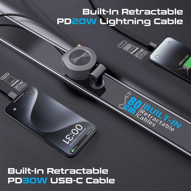 Built‑in retractable USB‑C cable for ~30W fast charging.
