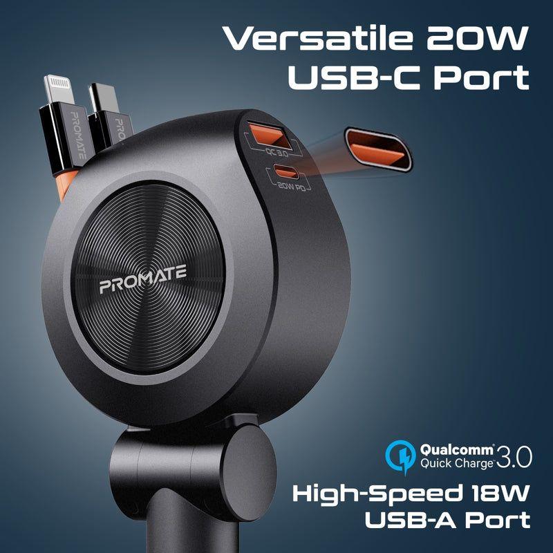Built‑in retractable Lightning cable for ~20W fast charging.