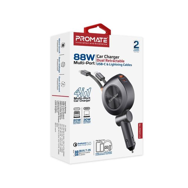 DriveGear‑R2 – 88W Multi‑Port Car Charger with Dual Retractable USB‑C & Lightning Cables